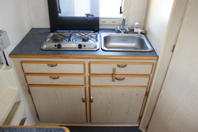 3 Flammengasherd, Spüle, Electrolux Kühlschrank mit Gefriertruhe.